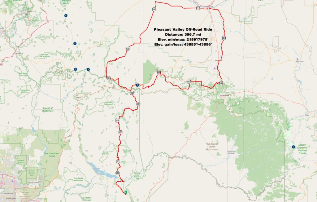 Since 2021 my wife and I have made this a yearly ritual where we start at sunrise (6:00am) from Topock on the Cali border on the first Monday in May and ride non-stop until we reach the New Mexico border near Blue Arizona. This seems to be the best time of the year to ride. The temps are not too bad in the deserts and generally the forest service roads and campgrounds are open the 1st of May for the start of the summer season.